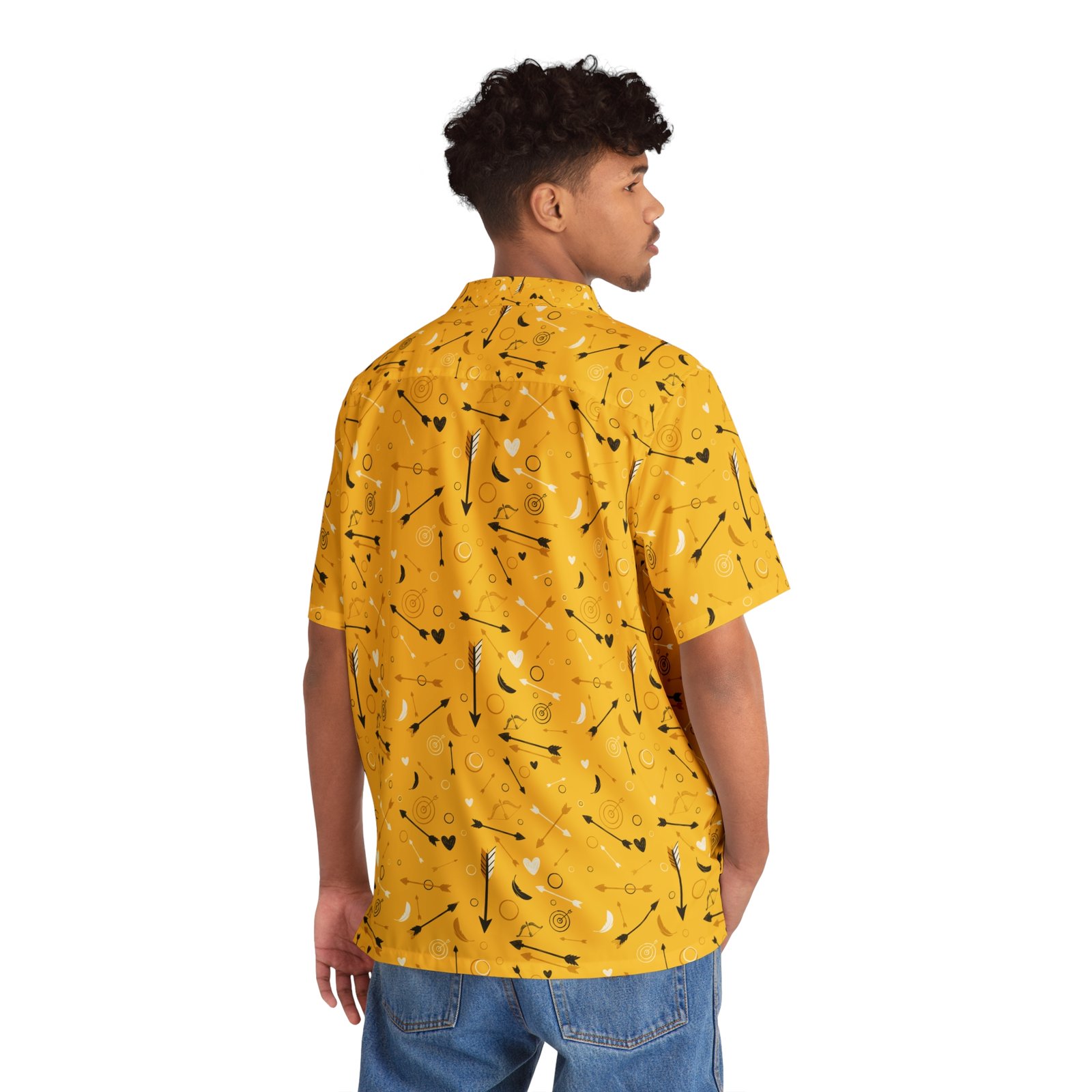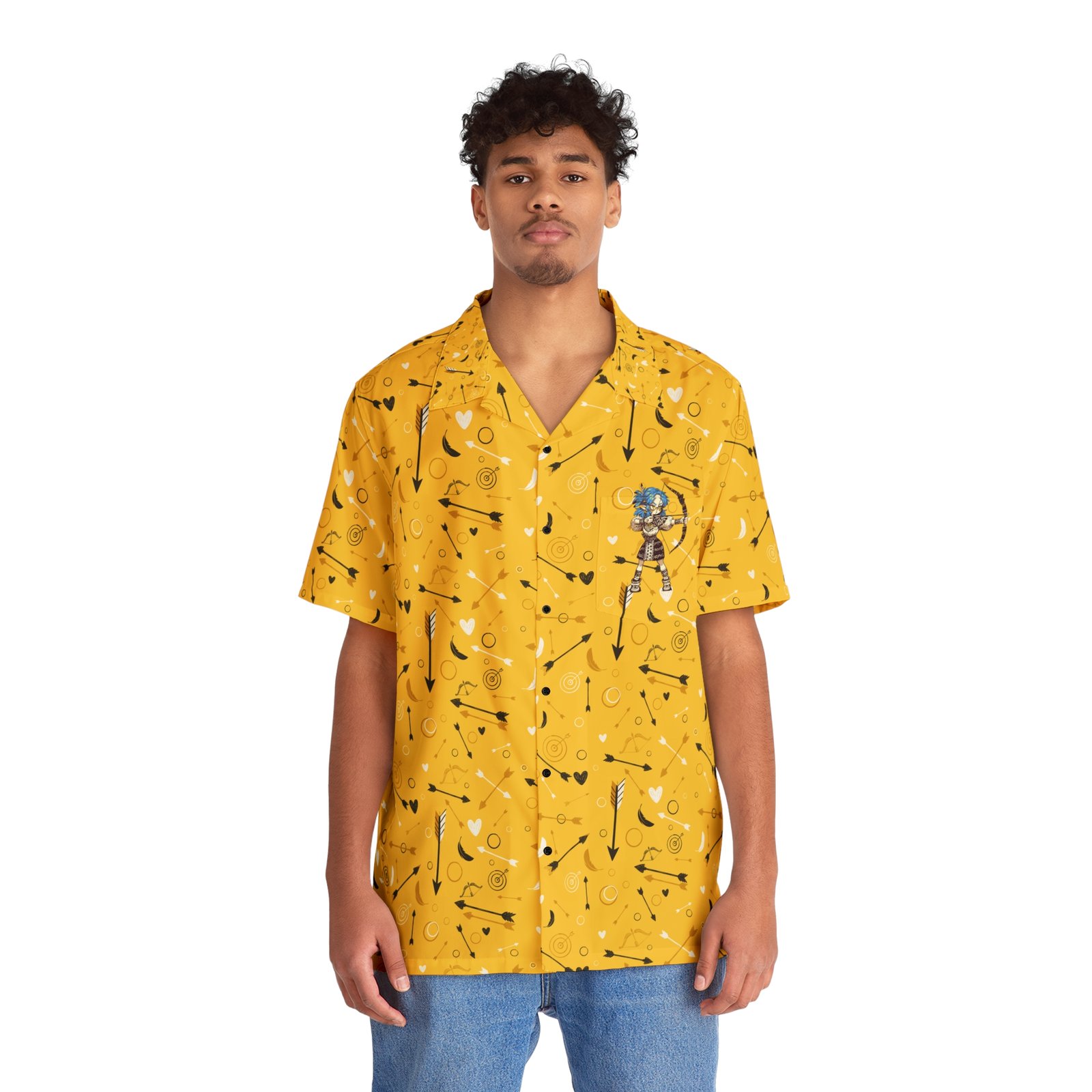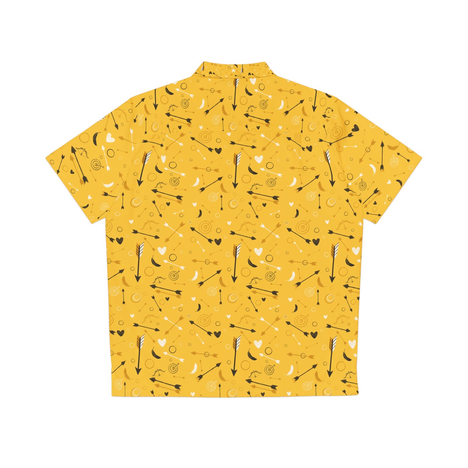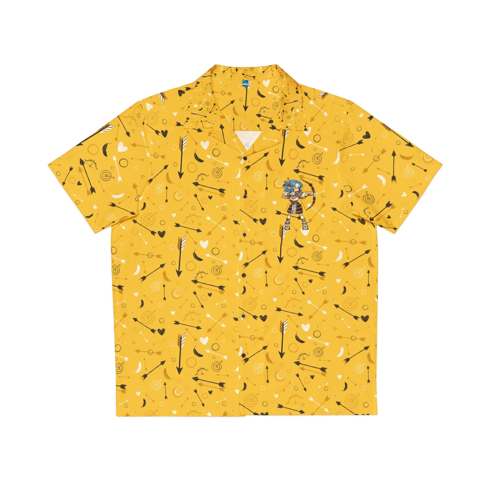 Hit the bullseye of fashion with this bold, yellow Hawaiian shirt, featuring striking black details and an archer design on the chest pocket. Perfect for those who love adventure and unique style, this shirt blends comfort and flair for any occasion.