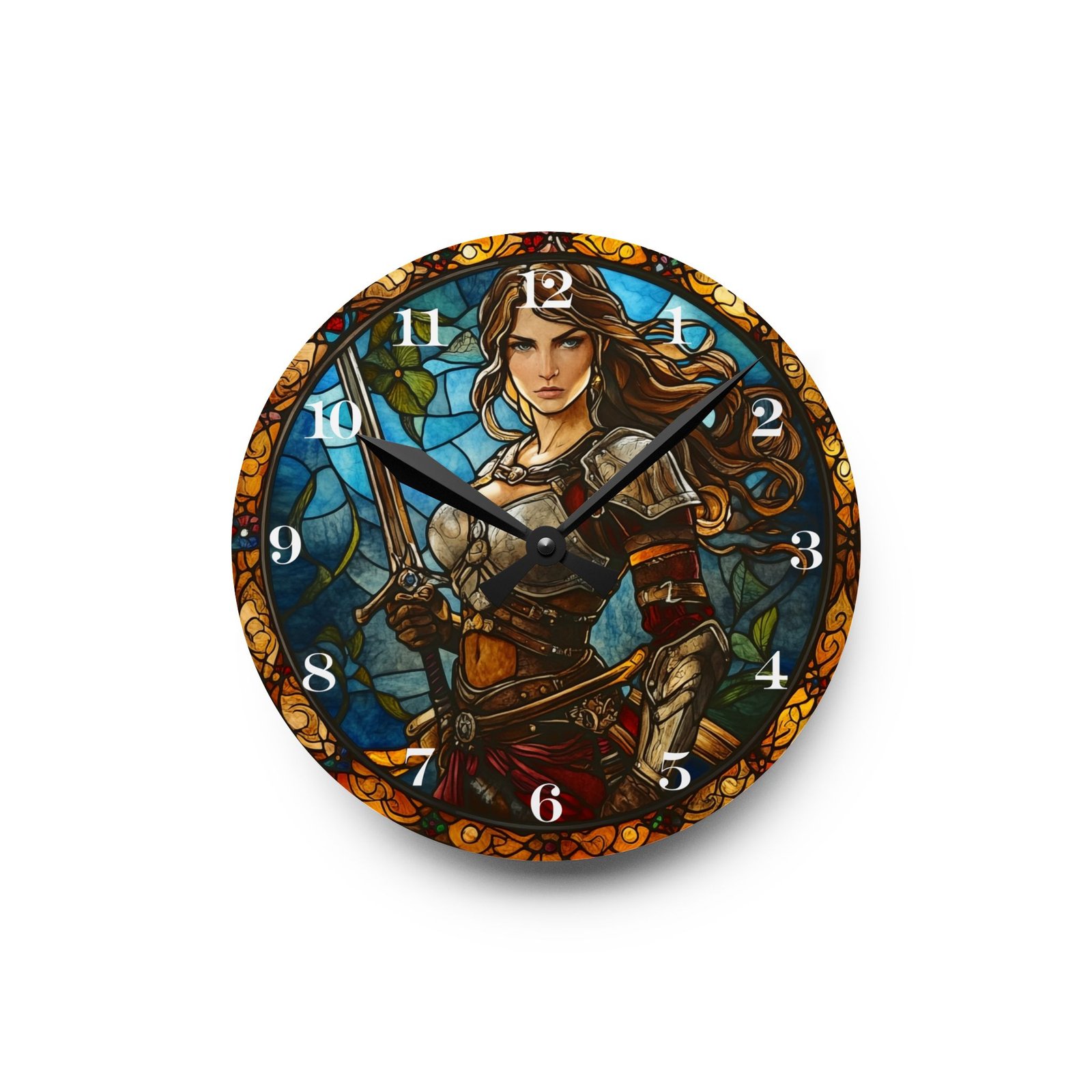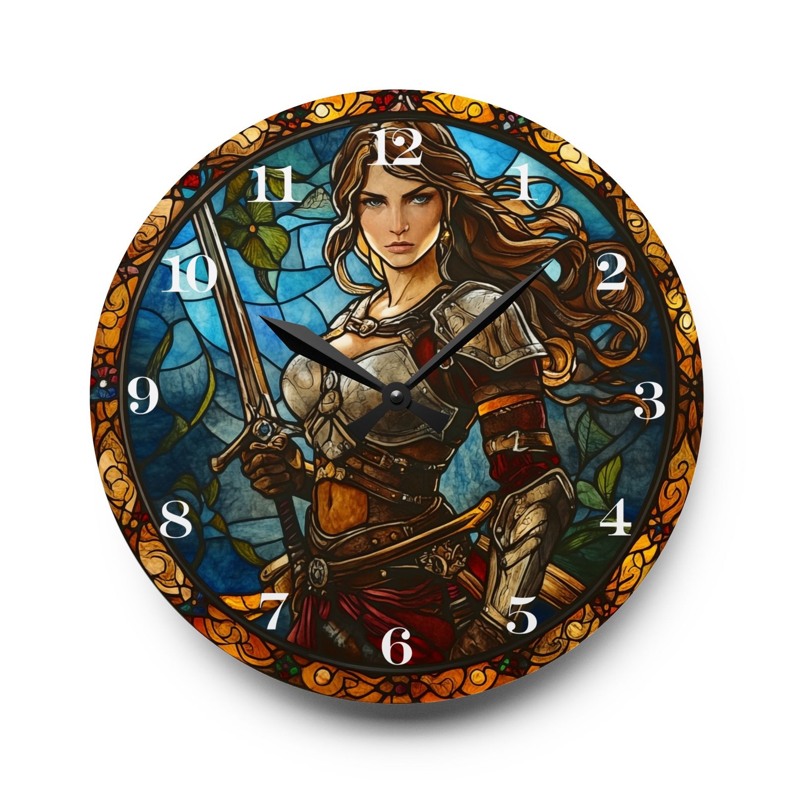 Crafted from durable, glass-like acrylic, this clock features a fearless warrior, sword in hand, ready for battle in a striking stained glass design. Available in round or square shapes and two sizes, this clock is perfect for those who admire bravery, strength, and timeless resilience.