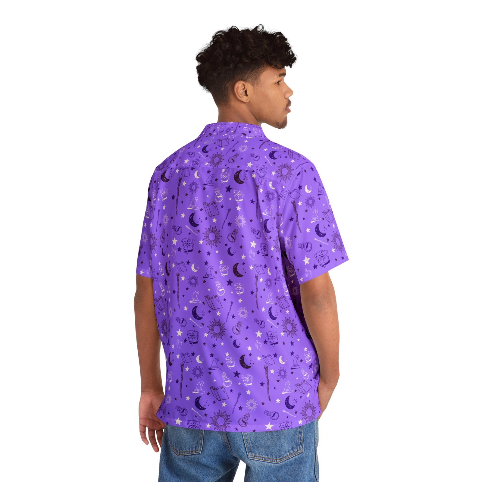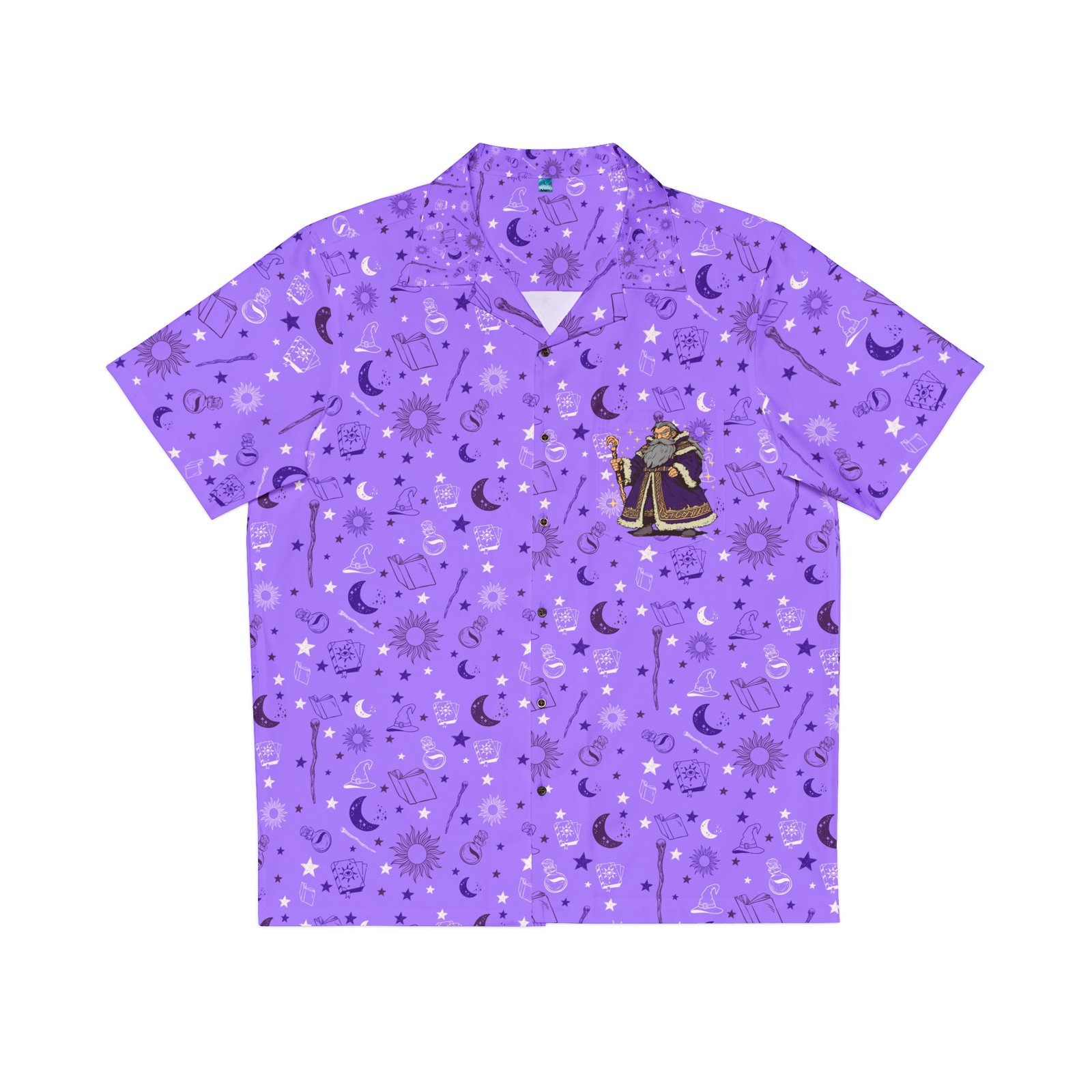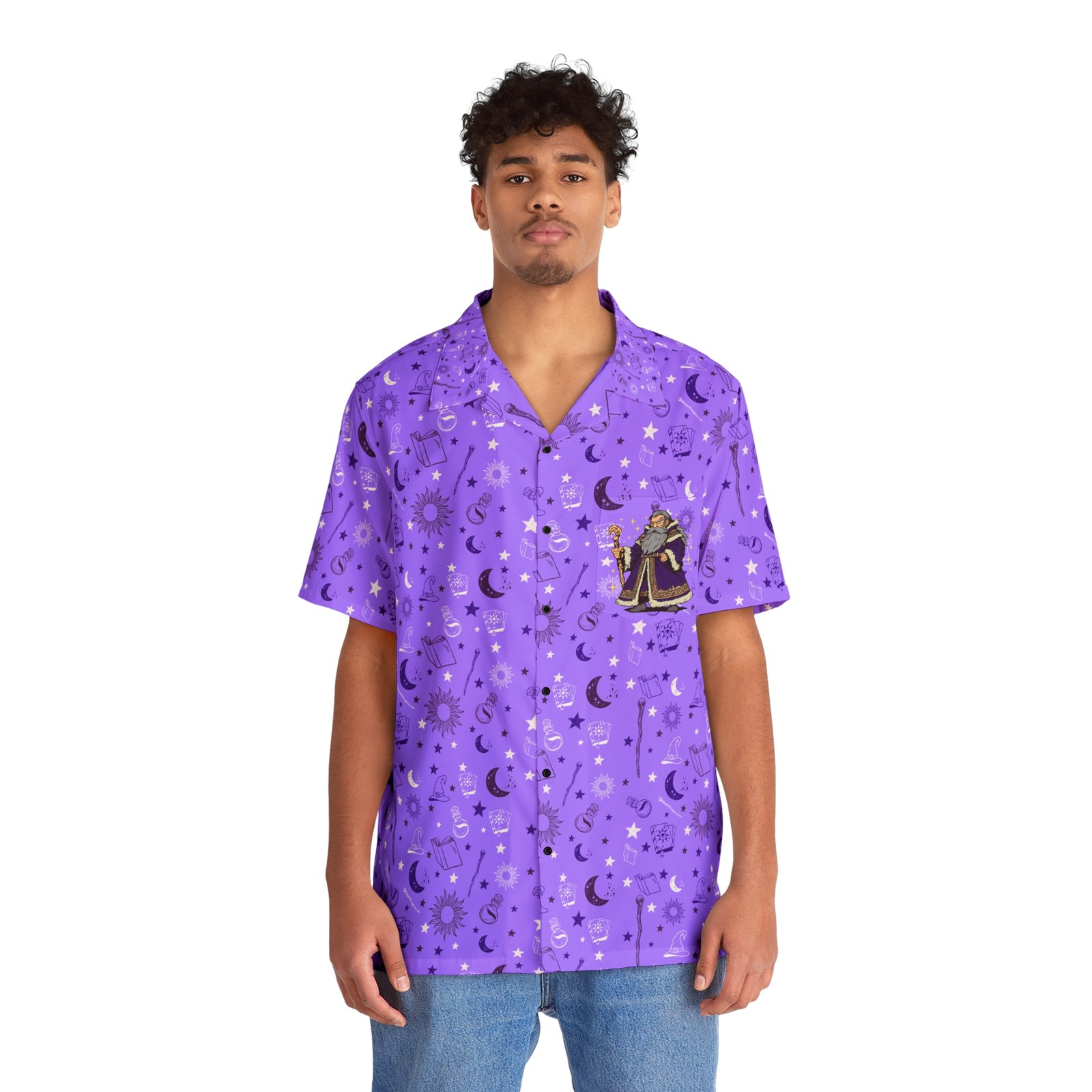 Step into a world of magic with this enchanting purple Hawaiian shirt, featuring black details and a mystical mage design on the chest pocket. Perfect for wizards, spellcasters, and adventurers who want to bring a touch of magic to their wardrobe.